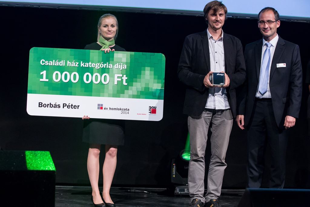 Az Év Homlokzata 2014 Pályázat családi ház kategória díját a pályázó Borbás Péter építész Kovács Pétertől, a Baumit Kft. gazdasági vezetőjétől vette át október 9-én a Budapest Kongresszus Központban tartott díjátadó gálán.