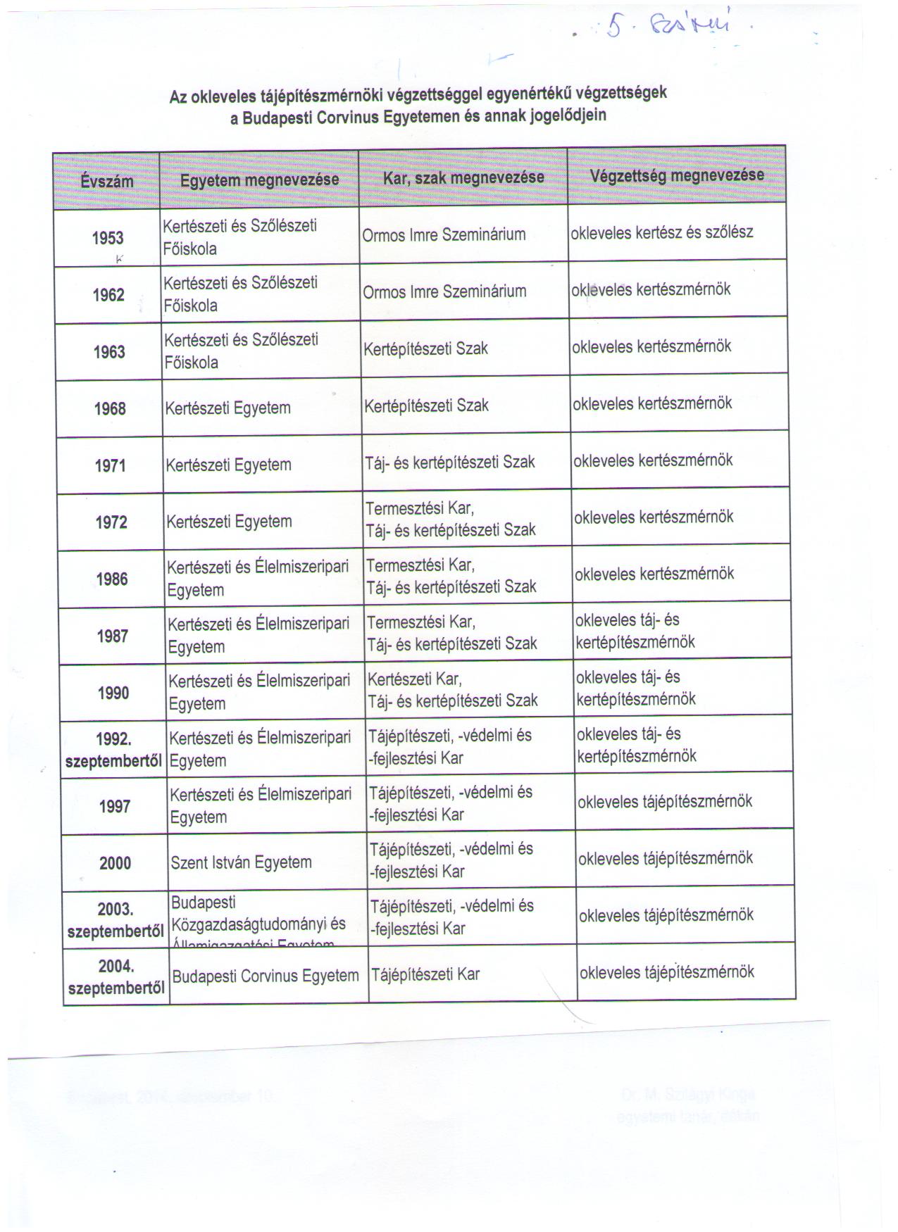Az okleveles tájépítészmérnöki végzettséggel egyenértékűek a Budapesti Corvinus Egyetemen és annak jogelődjein 1953 - 2004. szeptember között szerzett időszakban, a mellékelt táblázat szerinti végzettségek.