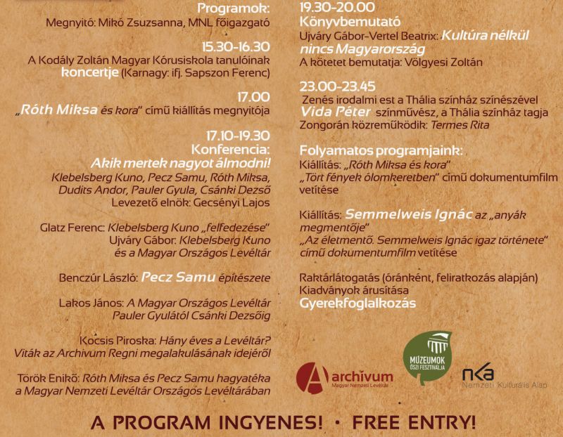Programunkból: 17.00 „Róth Miksa és kora” című kiállítás megnyitója 17.10–19.30 Konferencia: Akik mertek nagyot álmodni! Benczúr László: Pecz Samu építészete