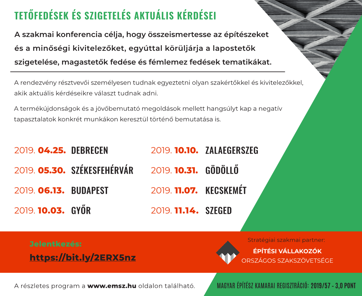 AZ ÉMSZ által szervezett szakmai konferencia sorozat célja, hogy összeismertesse az építészeket és a minőségi kivitelezőket, egyúttal körül járja a zöldtetők és lapostetők szigetelése, a magastetők fedése és fémlemez fedések és homlokzatok témákat, amit idén a szervező a tetőhöz kapcsolódó megújuló tematikával is kiegészített.