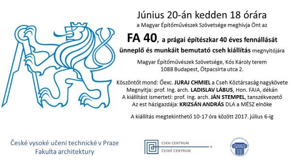A Magyar Építőművészek Szövetsége meghívja Önt Június 20-án kedden 18 órára az FA 40 a prágai építészkar 40 éves fennállását ünneplő és munkáit bemutató cseh kiállítás megnyitójára.
