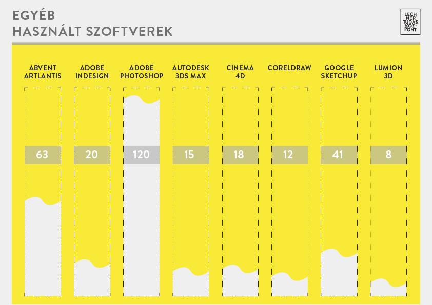 A Lechner Tudásközpont kérdőíve azt a kérdést is felteszi, hogy az alapvető tervezőprogram mellett milyen egyéb szoftvereket használnak a MÉK tagjai. Itt az első helyen – ahogy az várható is volt – az Adobe Photoshop végzett, amit a válaszadók 47%-a használ. A kérdőívet kitöltők valamivel több, mint egynegyede dolgozik Abvent Artlantis-szal, 18%-uk pedig Google Sketchup segítségével. Jelentősebb számban jelölték még meg az Adobe Indesign, az Autodesk 3Ds Max, a Cinema 4D, a CorelDraw és a Lumion 3D programokat (ennél a kérdésnél is lehetőség van több válasz együttes megjelölésére).