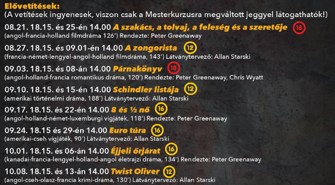 Október 16-21 . között szervezett filmfeszh'válunkon igazi nemzeúözí mesterek, a filmszakma kiválóságai vesz- nek részt. Peter Greenawa ,Allan Starski és Rajk László is mestelkurzusttart majd nálunk és itt lesz Trauner Sándor örököse, szellemi hagyatékának kezelője, Didier Naert látvánürvező is.