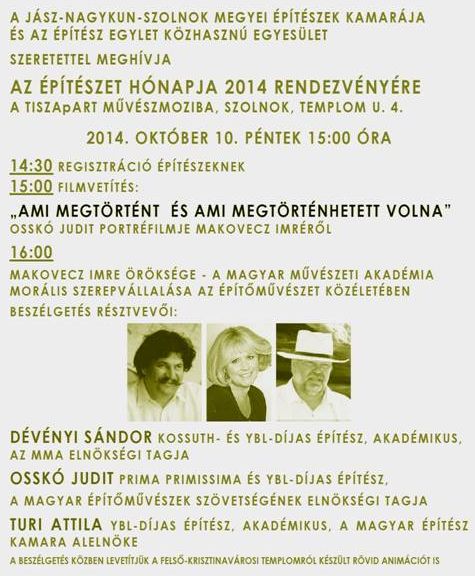 Időpont: 2014.10.10 Péntek 15:00 Helyszín: TISZApART művészmozi, Szolnok, Templom u. 4.