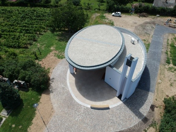 A 2017-ben épült ravatalozó épület szerkezetében, tömegformálásában, két eltolt tengelyű ellipszis illeszt össze az alaprajzon , ahol a gazdasági, személyzeti, előkészítő funkció körülöleli és vertikálisan is kiemeli a főfunkciót adó teret. A két ellipszis nem öncélú: a jézusi hal motívumát éppúgy idézi, mint a hagyományos barokk tér centrális, de mégis irányított terét. A ravatalozó tömbje színeiben, anyag használatában szakít jellemző komor, sötét hangulattal. Letisztult formavilágával, sallangoktól mentes belső terével segít rendet tenni a lelkekben és a részvevők figyelmét a szertartásra irányítja. A lélekharang kiemelkedő tornya páros pillér motívuma ellensúlyozza ellipszis felületeket,magasságával kiemeli az épület szakrális jelleget.
