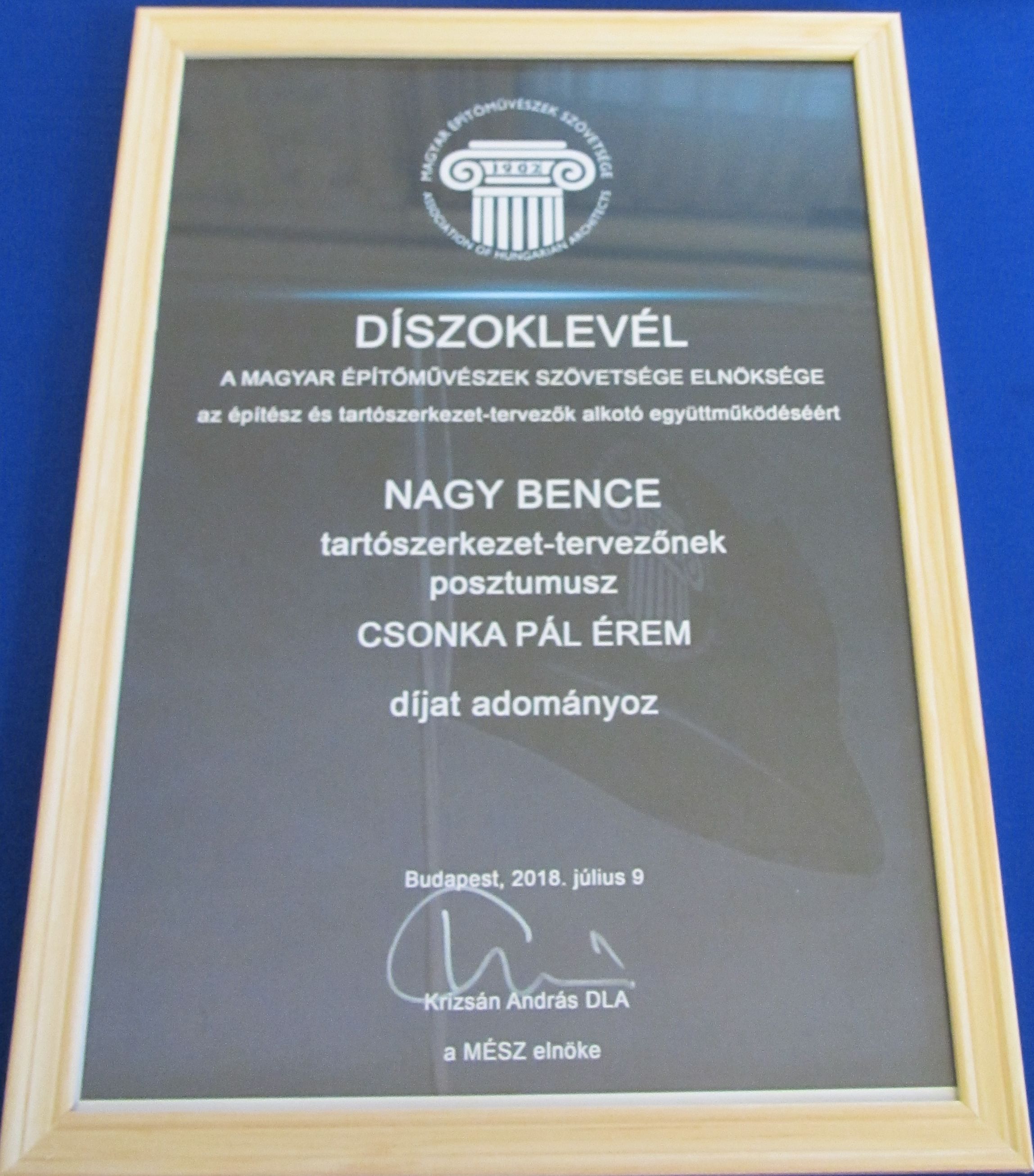 Idén a MÉSZ Elnöksége a Kuratórium javaslatára Patonai Dénes DLA prof. emeritus építészmérnök és Nagy Bence Ybl díjas szerkezettervező-mérnök (posztumusz) alkotópárosnak adományozta az érmet.
