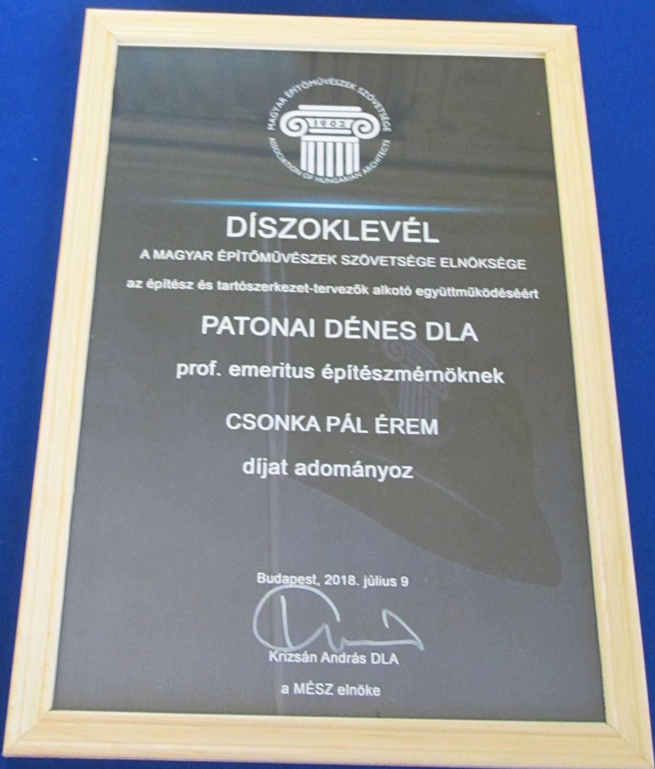 A Magyar Építőművészek Szövetsége 1988-ban alapította Csonka Pál - érmet, a Professzor úr emlékére.