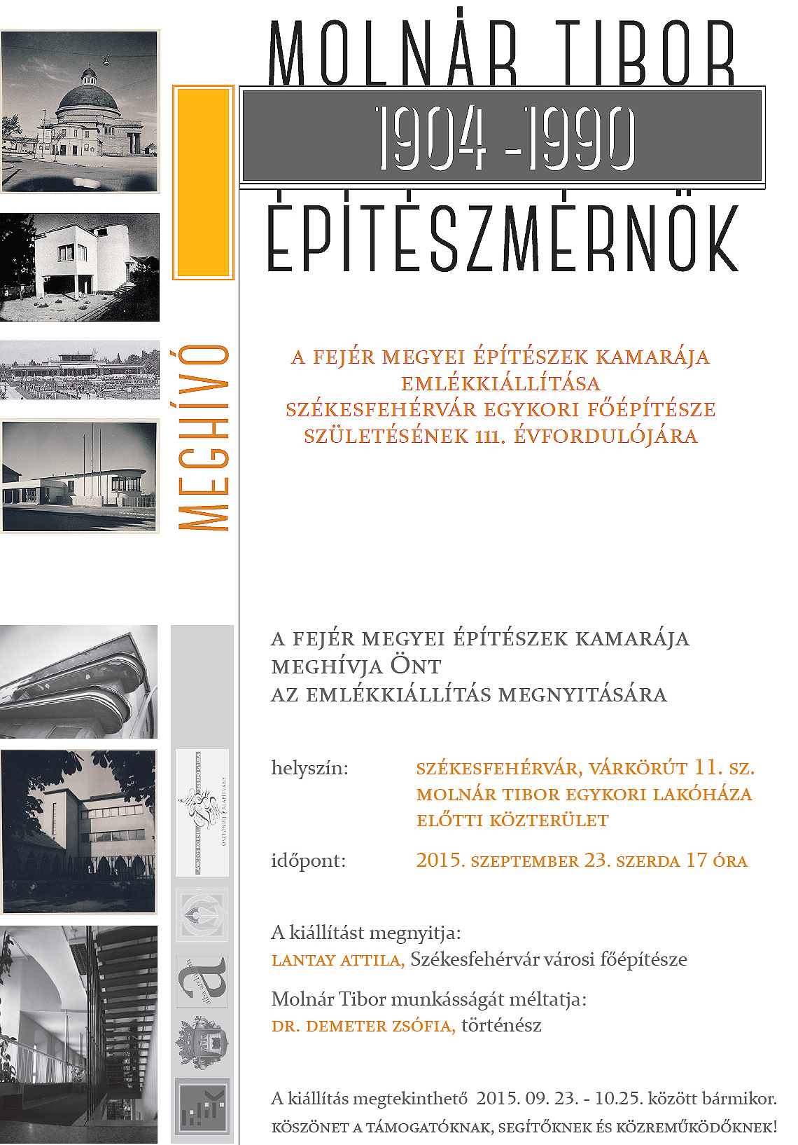 Kamaránk emlékkiállítást szervez Molnár Tibor, egykori városi építész, főmérnök születésének 111. évfordulójára Székesfehérváron, a Várkörút 11. szám (az építész egykori háza) előtti járdán 2015. szeptember 23-i megnyitással. A kiállítás bármikor megtekinthető 2015. október 25-ig. Mind a megnyitóra, mind a kiállítás megtekintésére tisztelettel meghívom a MÉK és a Területi Kamarák tisztségviselőit, a kamarák tagjait.