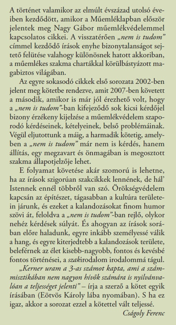 A Pest Megyei Kormányhivatal és a Hungarovox Kiadó szeretettel meghívja Nagy Gábor NEM IS TUDOM… harmadszor Új írások műemlékvédelemről és másról