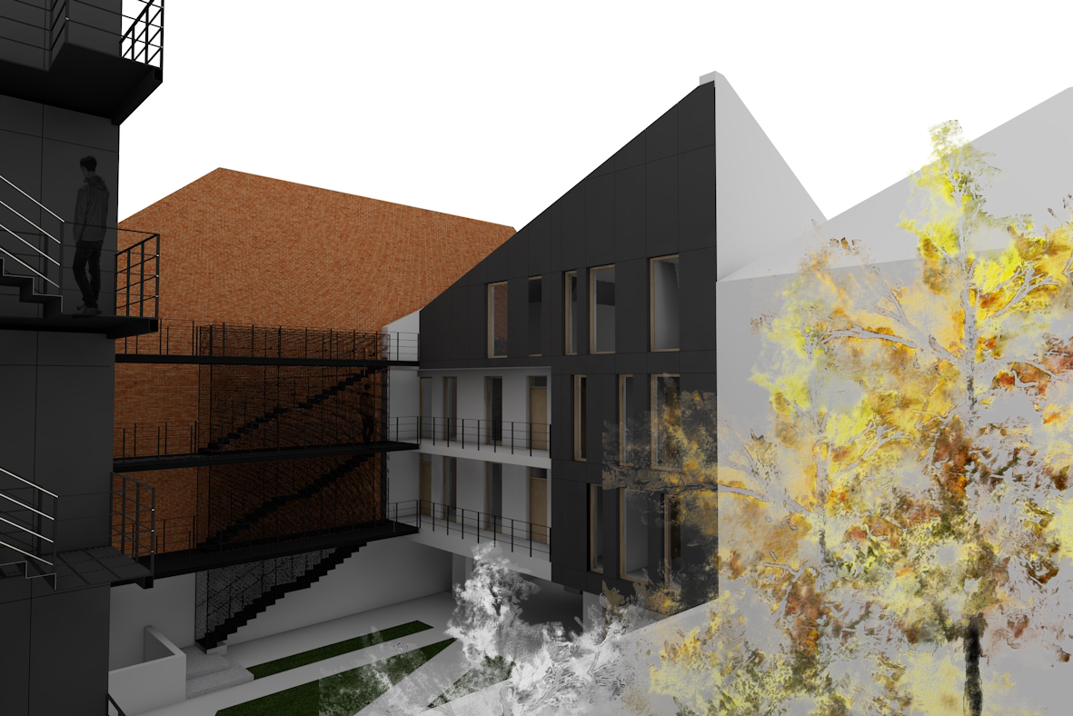 A PTE Műszaki és Informatikai Karának hallgatója, Tarr Zsuzsanna a tető és a homlokzat tekintetében egységes megjelenésre törekedett Pécs átalakuló részére tervezett társasházon, ezért úgy döntött, hogy az EQUITONE szálcementből készült a homlokzat burkolat a tetőn folytatódik. A szintén szálcementből készült nyílászárók előtti árnyékolók a homlokzat megjelenését teszik dinamikusabbá. A vagyonvédelmet és a szellőzés-megvilágítást a földszinti tárolók nyílászárói előtt perforált burkolóelemek teszik változatossá. „A tervezett épület Pécsen egy meglehetősen összetett beépítési helyzetbe került. A tervező szellemesen telepítette épületét, izgalmas külső tereket létrehozva. Az épület tömegformálása, részletképzése, színe egyaránt nagyon mai, finom építészeti szemléletű. A homlokzat burkolataként használt antracit színű EQUITONE burkolat nagyon jól támasztja alá az építészeti elképzelést és minőségi, időtálló épület reményével kecsegtet.” – méltatta Kertész András Tibor, Ybl Miklós és Pro Architectura díjas építész, a zsűri tagja az építészhallgatók között második díjat érdemelt pályaművet.