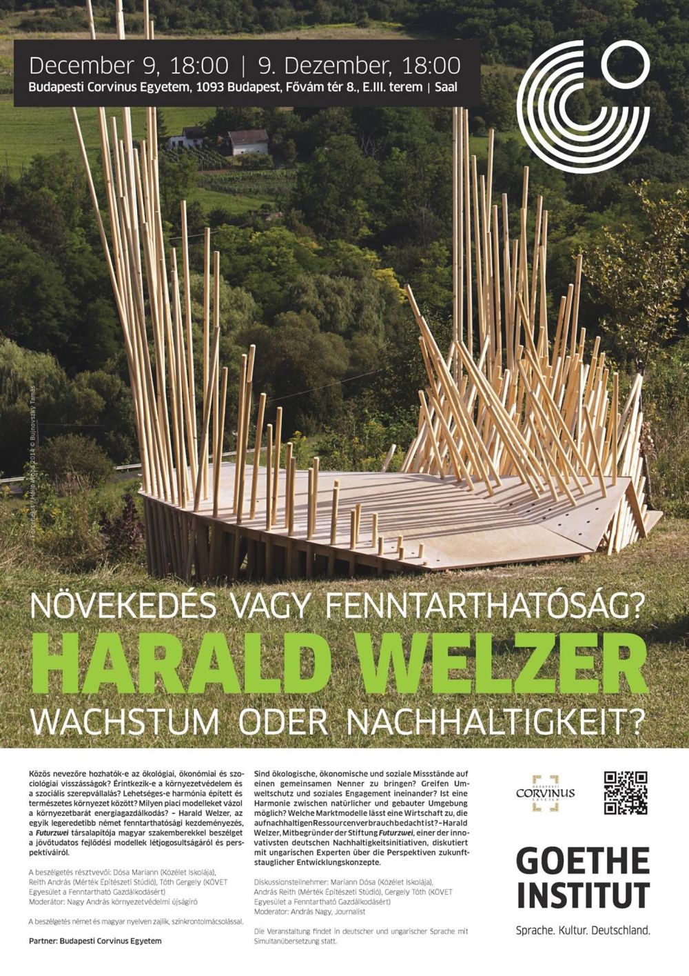 December 9-én a Goethe Intézet meghívására a Corvinus Egyetemen pódiumbeszélgetésen vesz részt Harald Welzer professzor, a fenntartható fejlődés és az alternatív gazdasági formák világszerte ismert teoretikusa.