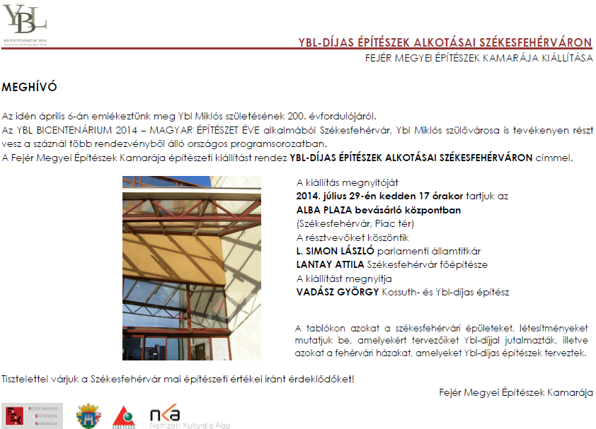 Az Ybl Bicentenárium 2014 – Magyar Építészet Éve alkalmából Ybl Miklós szülővárosa Székesfehérvár is tevékenyen részt vesz a száznál több rendezvényből álló országos programsorozat szervezésében. A Fejér Megyei Építészek Kamarája építészeti fotókiállítást rendez Ybl-díjas építészek alkotásai Székesfehérváron címmel. A kiállítást július 29-én, kedden 17 órakor nyitják meg az Alba Pláza bevásárlóközpontban (Székesfehérvár, Piac tér).