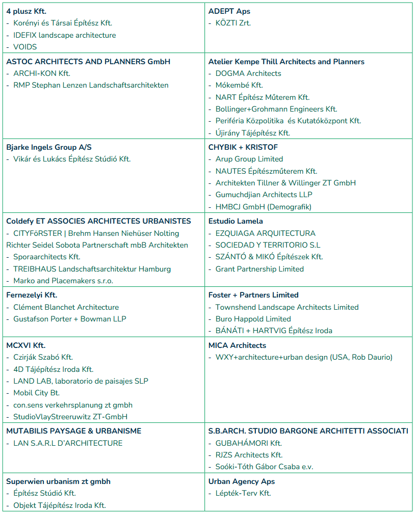 A Rákosrendező tervpályázat első fordulójában a Kiíró részvételi jelentkezések bírálata alapján a következő alkalmasnak minősített és a rangsorolás alapján kiválasztott 16 pályázót kéri fel pályamű benyújtására ABC sorrendben.