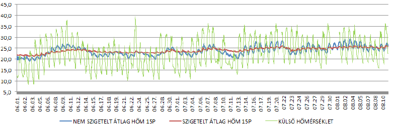 A mérésbe vont időszak egésze alatt megfigyelhető volt, hogy a megfelelően szigetelt épületben lényegesen kiegyenlítettebb a belső hőmérséklet: az alábbi ábrán látható, hogy a napon belüli és a heti hőmérsékletváltozás is kiegyenlítettebben jelent meg. Kijelenthető, hogy a szigetelt épület kevésbé van kitéve a külső hőmérsékváltozás hatásainak. Hűvösebb időben - pl. június közepén - a belső hőmérséklet 2-3 oC-kal magasabb volt a szigetelt épületben. Melegebb időszakokban pedig – pl. augusztus elején - a szigetelt épület felmelegedése (csúcsértéke) lényegesen kisebb mértékű volt a szigeteletlen épülethez képest.