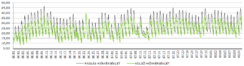 Az épületenergetikai tervezés egyik fontos alappillére az optimális épületburok meghatározása, mely során cél, hogy a lehető legkisebb térfogatú tér kerüljön fűtésre, ill. hűtésre. Ebből a megfontolásból adódóan beépítetlen padlástér esetén a hőszigetelés optimális elhelyezése a padlásfödémen adódik, ekkor a padlástér a tető vonalában természetesen nem kerül szigetelésre. Ilyen helyzettel találkoztunk az egyik épületben is, megvizsgáltuk a tető vonalában szigeteletlen és szellőzés nélküli padlástérben uralkodó hőmérsékleti értékeket. Látható, hogy a hőmérséklet ingadozása óriási, napsütéses, 37 oC körüli hőmérséklet esetén a padlástér hőmérséklete a 45 oC-ot is eléri. Ezen mérés is alátámasztja, hogy a padlásterek nyári átszellőztetése elengedhetetlen a kedvező belső klíma biztosítása érdekében.