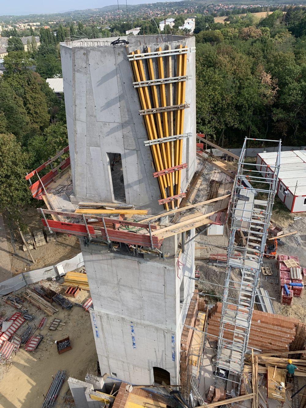 „A templomon belül a két tornyot, mint érdekességet mindenképpen érdemes megemlíteni. Geometriájuk ugyanis eltér egy átlagos toronyétól. A húsz méteres magasságban található, 6 m magas befele dőlő falak építése sajátos alkalmazástechnikát igényelt: egy oktogon alakú felépítmény épült a csúcsig, amelyhez a MEVA 135 fokos fix sarkokelemeit nagy elégedettséggel és jó eredménnyel alkalmaztuk!” -emelte ki Cserháti József.