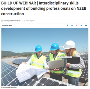 On 21 November, PROF/TRAC offered a BUILD UP webinar about “Interdisciplinary skills development of building professionals on nZEB construction”. The webinar focused on the skills required by the building industry middle and senior level professionals, and on how to address the skills gap through Continuing Professional Development (CPD) courses. Invited speakers displayed the expertise they developed by organizing or attending such courses, with special attention to the market appreciation for the skills acquired by participants. The recording of the webinar will soon be available on the BUILD UP portal.