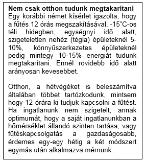 Tipp: Az alacsony hőmérsékleten tartás csupán azt eredményezi, hogy akkor is fűtjük a lakást, amikor senki nem élvezi annak előnyét, amikor pedig otthon vagyunk, nincs elég meleg. Érdemes tehát mérni és kitapasztalni, hogy saját ingatlanunk esetén a fűtésmegszakítás vezet-e energia megtakarításhoz. Végleges megoldást pedig a jó nyílászárók és a megfelelő szigetelés adhat.