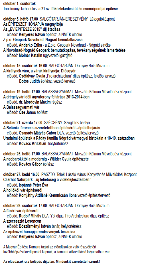 OKTÓBER - AZ ÉPÍTÉSZET HÓNAPJA A NÓGRÁD MEGYEI ÉPÍTÉSZ KAMARA 2015. OKTÓBERI RENDEZVÉNYEI