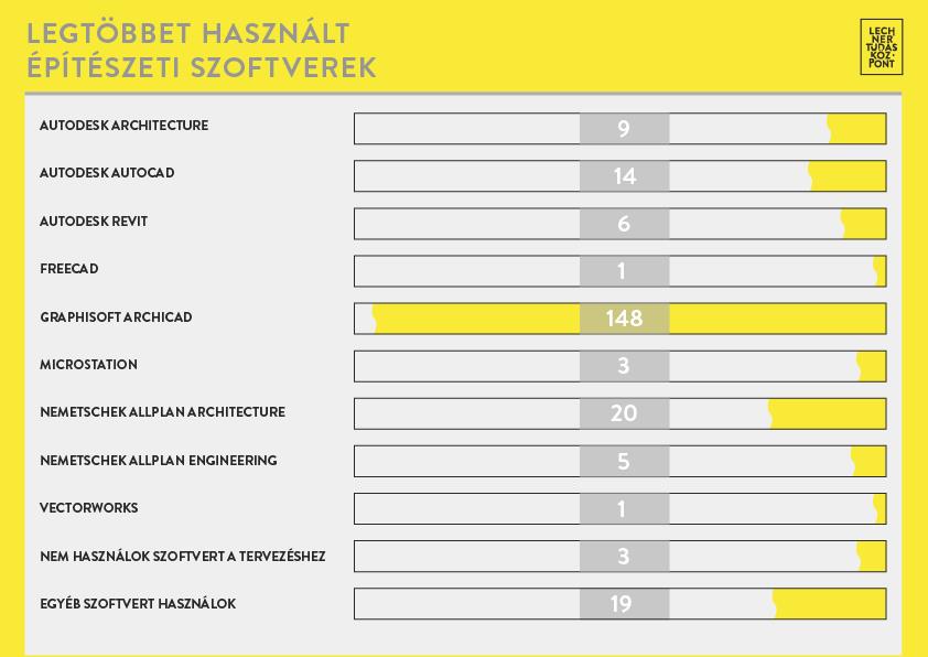 Az eddig kitöltött kérdőívek azt mutatják, hogy a magyar építészek körében a hazai fejlesztésű ArchiCAD a legnépszerűbb tervezőprogram, 64%-os aránnyal. A második helyen a Nemetschek Allplan Architecture áll, a vártnál nagyobb, 9%-os eredménnyel. A tervezők 8%-a használ valamilyen egyéb szoftvert. Az Autodesk szoftverei közül az AutoCAD 6%, az AutoCAD Architecture 4%, a Revit pedig 3% elterjedtségű. (Ez utóbbinál a tapasztalatok alapján nagyobb arány lett volna várható.) 2%-os felhasználási arányt képvisel a Nemetschek Allplan Engineering, a Microstation pedig 1%-ost. Szintén a válaszadók 1%-a nyilatkozott úgy, hogy semmilyen szoftvert sem használ a tervezéshez. Közel 0,5% használja a Nemetschek Vectorworks, s ugyanennyi a FreeCAD programot.