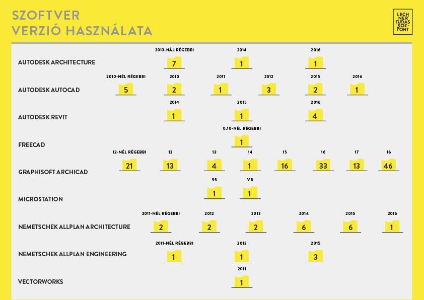 Az ArchiCAD felhasználók közül a legtöbben (a válaszadók egyharmada) a legújabb, 18-as verzióval dolgoznak, ugyanakkor feltűnő, hogy jelentős a régebbi, akár sok éves változatok használata is. A Nemetschek programot használóknál az a tendencia állapítható meg, hogy viszonylag új, egy-két éves verziókkal terveznek. Ezzel szemben az Autodesk progjamjai közül csak a Revit-nél jellemző a legújabb verziók használata, az Autodesk Architecture és az AutoCAD esetében is sokan használnak 3-5 évnél régebbi változatokat.
