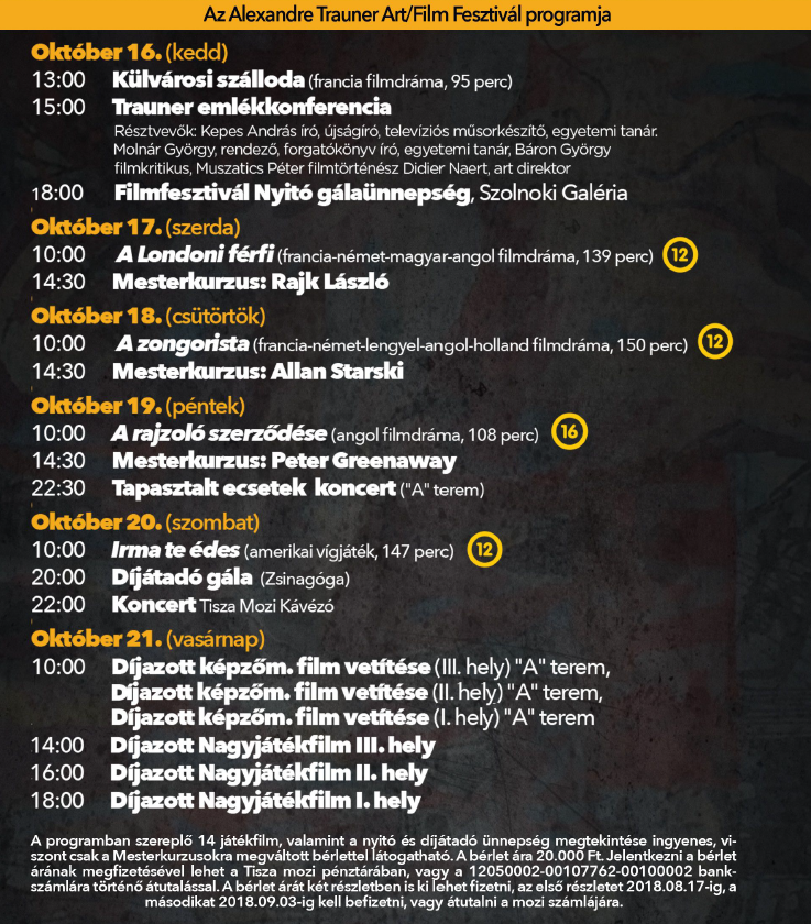 A fesztiválon 11 új és öt régebbi nagyjátékfilm mellett műsorra kerül majd 40 órányi animációs és dokumentum- film is a világ minden részéről. Első ként a szolnokiaknak szeretnénk felajánlani a hírességekkel való találkozás, a mestelkurzusra és a vetítésekre való jelentkezés lehetőségét. Csak a városban élők részére összeállítottunk egy olyan kedvezményes csomagot, ami lehetővé teszi előzetesen levetített nyolc film megtekintését, a Trauner Sándor konferencián és a három mesterkurzuson való részvételt.
