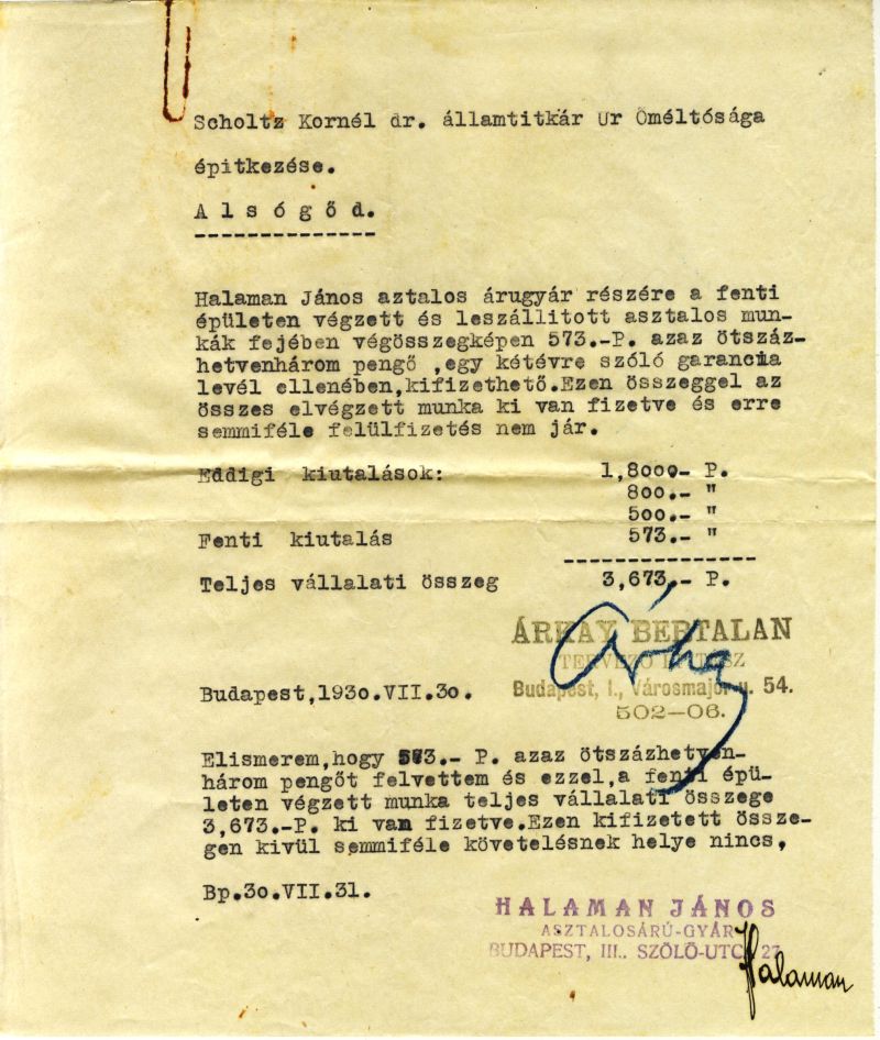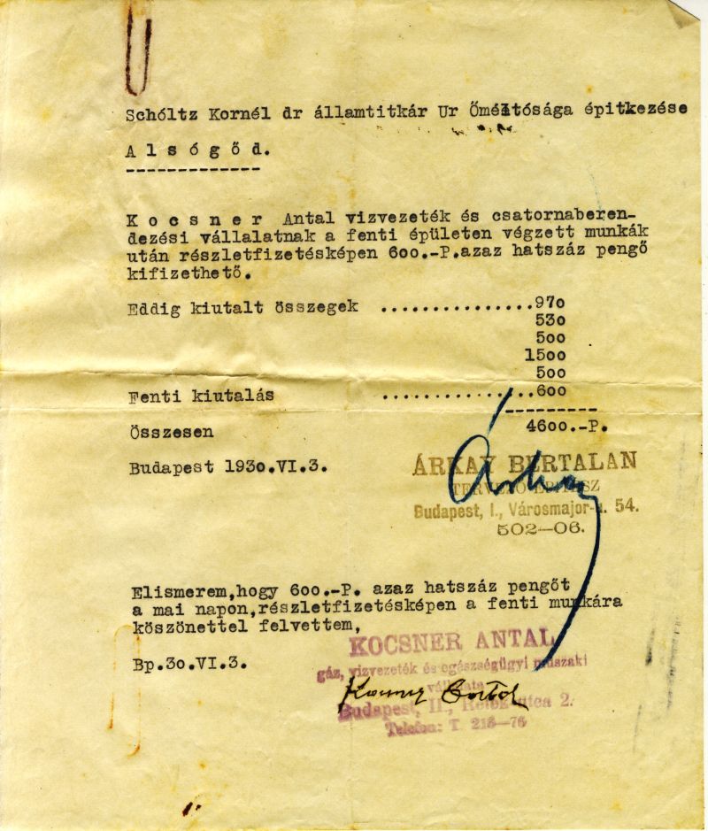 Hazatérve bátyám azonnal kikereste a családi irat- és dokumentumtárból azokat az elismervé-nyeket, amelyek ezt a tényt bizonyítják. Tőle kaptam a régi fotókat is, és az ő érdeme, hogy a cikkben leírt adatok megfelelnek a valóságnak. A 2. ábrán látható két ilyen dokumentum má-solata Árkay Bertalan bélyegzőjével és aláírásával (a dokumentumokat később átadtuk a BTM Kiscelli Múzeum Építészeti Gyűjteményének, ahol az épület terveit is őrzik). Ezekből a do-kumentumokból az is kiderül, hogy abban az időben az építésztervező nemcsak a tervek ké-szítője, hanem az építkezés irányítója és egyben műszaki ellenőre is volt, hiszen az ő aláírása nélkül a kivitelező nem kaphatta meg járandóságát. A tervező, mint hozzáértő szakember egyben a beruházó-építtető tanácsadója is volt. Az elszámolás szerint az épület 36 563,50 pengőből épült fel.