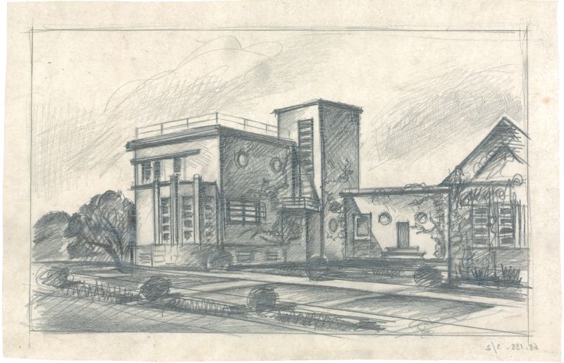 3. ábra – Árkay Bertalan ceruzás vázlata a tervezett épületről, amely a kert felől mutatja azt (Forrás: BTM Kiscelli Múzeum Építészeti Gyűjtemény, leltári szám: 68.139.3_2.)