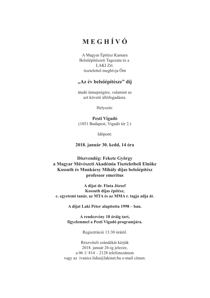 A Magyar Építész Kamara Belsőépítész tagozata és a LAKI Zrt. szeretettel meghívja Önt "Az év belsőépítésze díj" átadó ünnepségére és fogadására.