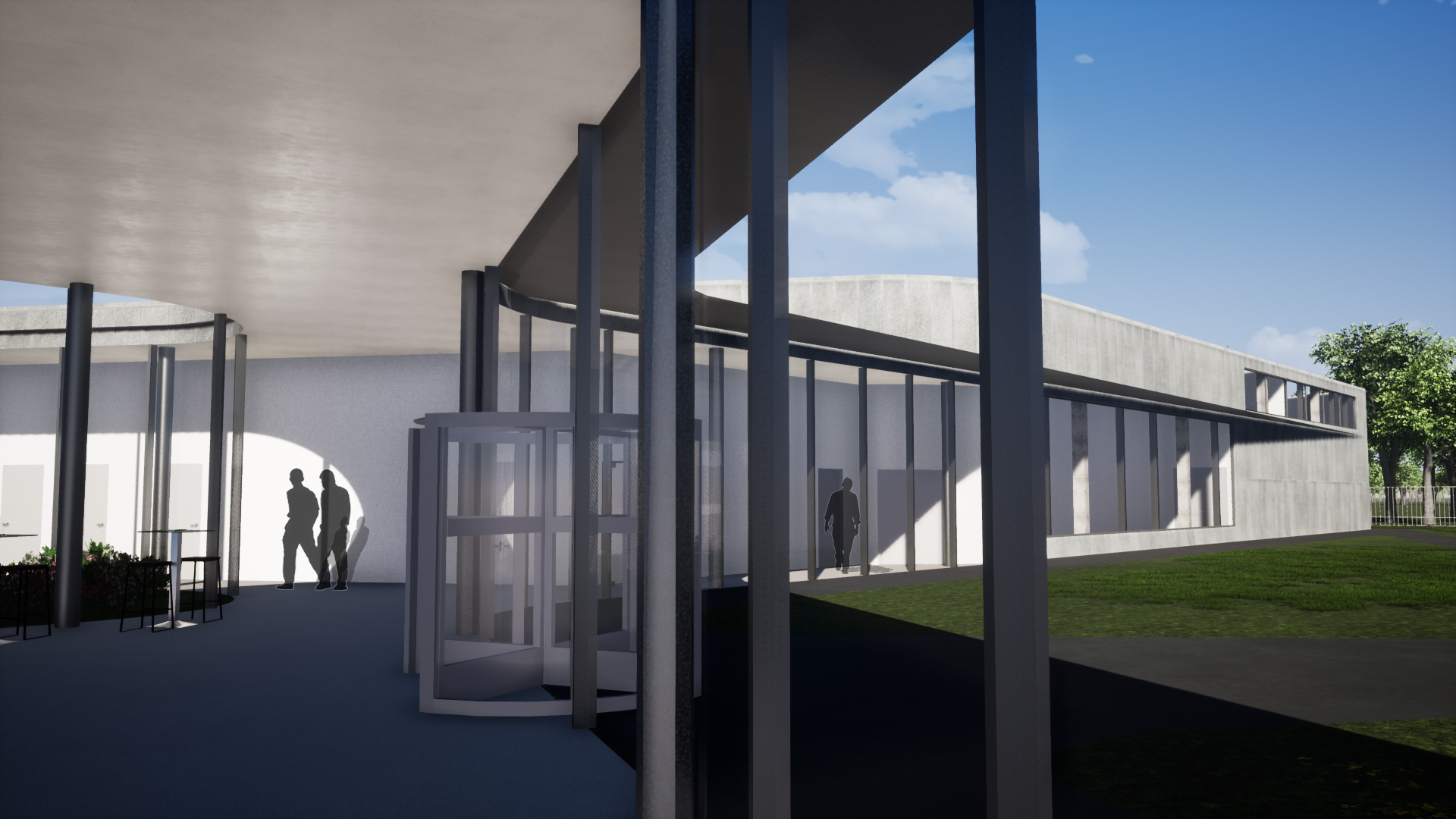 A 70 méter széles bejárati homlokzat valóban homlokzat. Erre az egyetlen feladatra komponált felület és fedett átmeneti tér, amolyan 180 fokban működő mágnes. A hazai előképekhez képest a bejárati homlokzatnak ez a sallangmentes, mégis rangos, épületléptékű megoldása újszerű, némiképpen a repülőterek viselkedését idézi – nem ok nélkül. Biztosak lehetünk abban, hogy a város felé tett gesztus üzletileg is megtérülő, jó befektetésnek bizonyul majd.