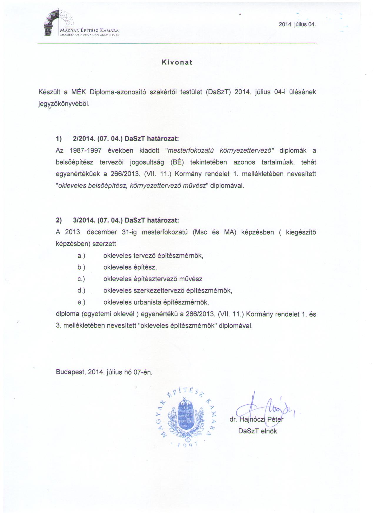 Diploma-azonosító szakértői testület 2014. július 04-i ülésének kivonata a 2. és 3. számú határozatok