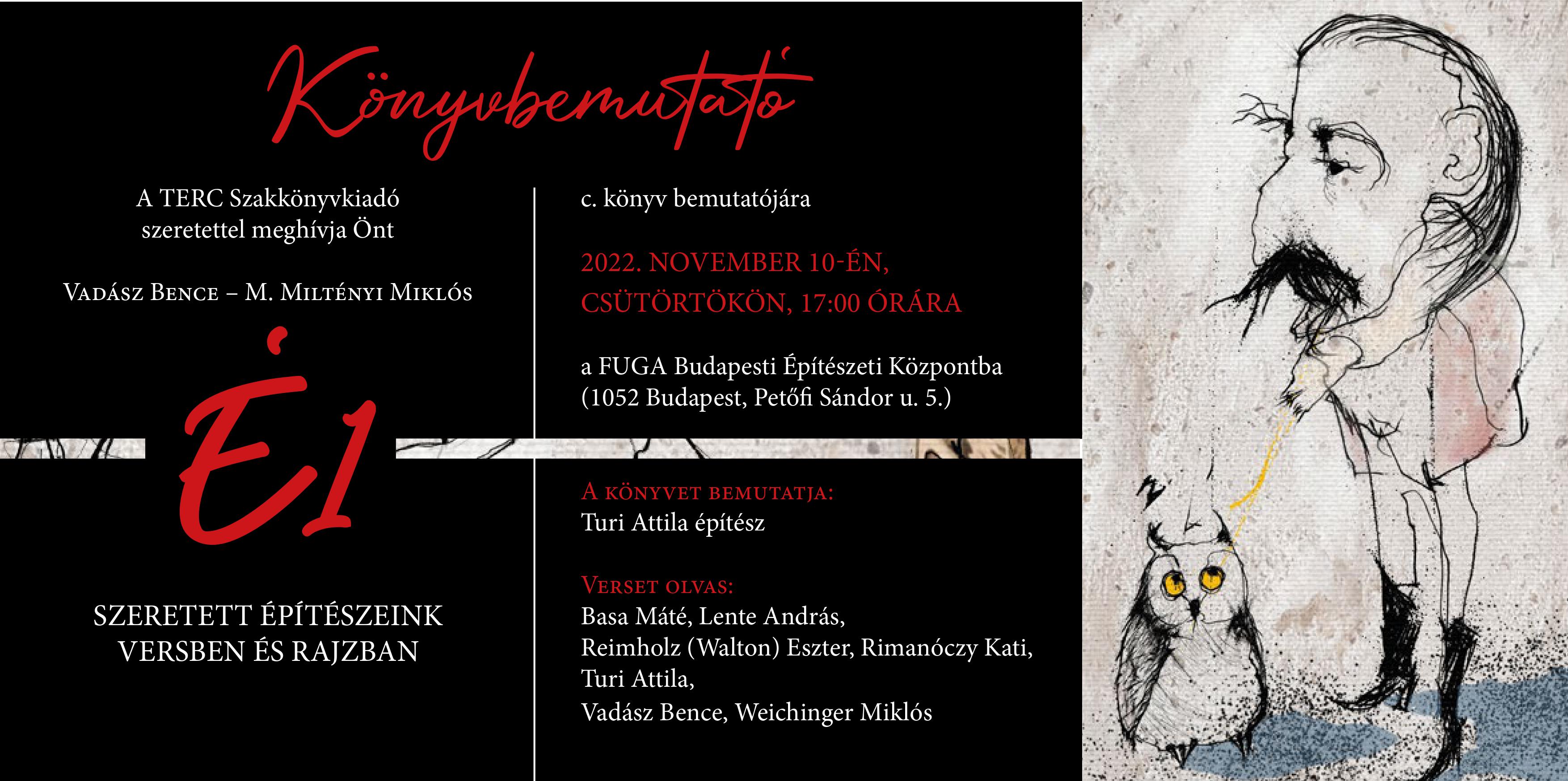 Vadász Bence – M. Miltényi Miklós: É1 – Szeretett építészeink versben és rajzban című könyv bemutatója 2022. november 10.csütörtök 17.00 órakor FUGA
