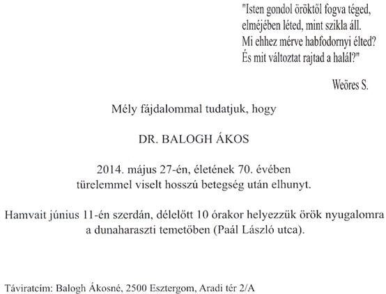 Mély fájdalommal tudatjuk, hogy 70. életévében elhunyt Dr. Balogh Ákos.