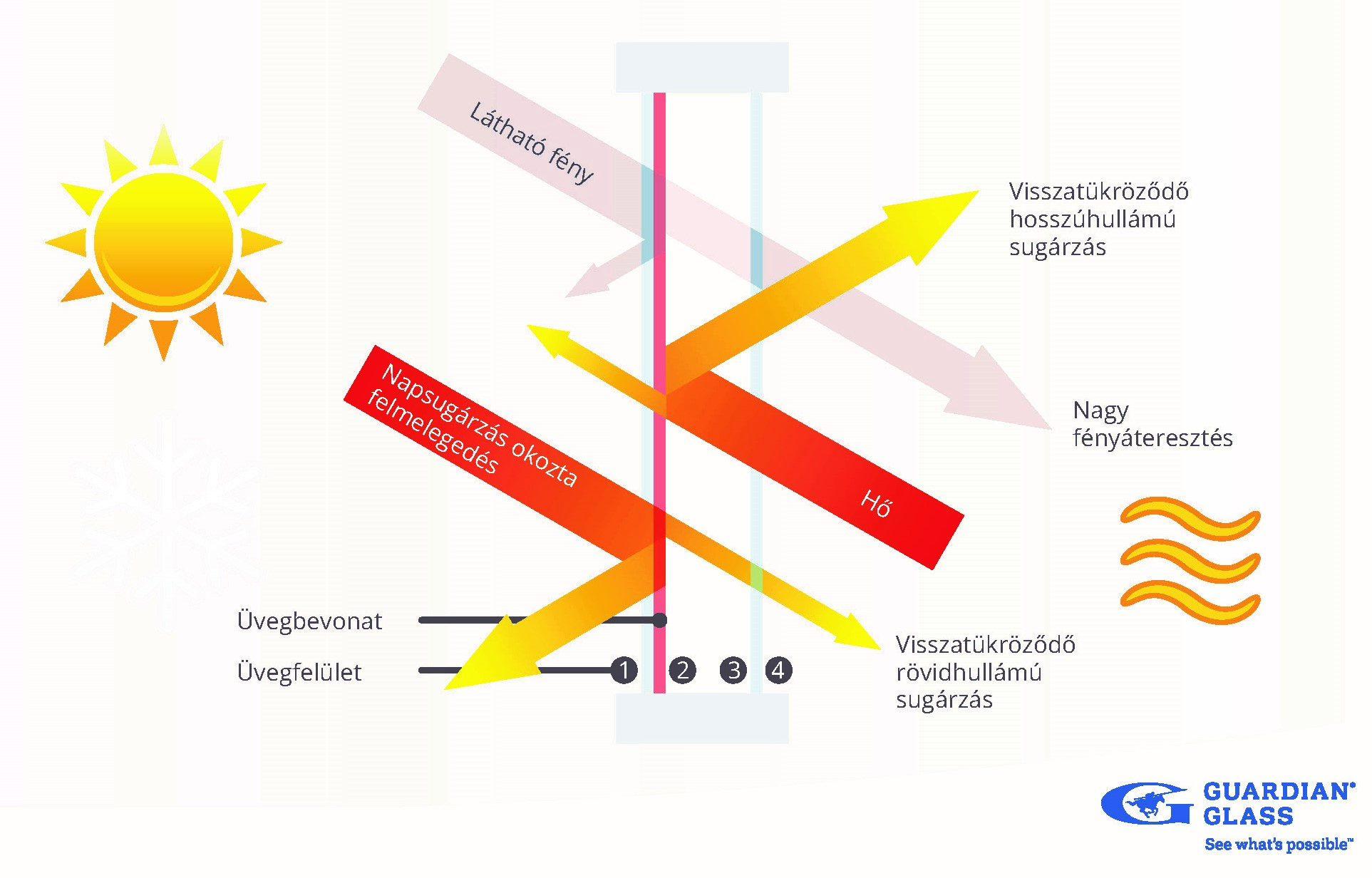 A fentebb felsorolt kritériumok teljesítéséhez szükséges összes üvegezési megoldás megtalálható a Guardian Glass választékában. Ilyen például a Guardian SunGuard® termékcsalád is, amelynek magas szelektivitású termékei nagy fényáteresztést biztosítanak, miközben szabályozzák a napsugárzás hőátengedését. Ez a technológia segít a jól megvilágított terek kialakításában, miközben meggátolja a belterek túlmelegedését a nyári hónapokban, mindazonáltal télen hatékony védelmet biztosít a hőveszteség negatív hatásaival szemben is. Ezen tulajdonságaiknak köszönhetően ezek az üvegek igazán megfelelő választásnak bizonyulnak a modern és energiahatékony épületek kivitelezéséhez.