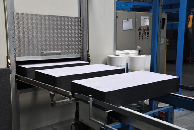 Az Austrotherm fóliával ellátott termékeket a sor végén robotkar helyezi a kihordó pályára, majd targoncával a készáru raktárba szállítják, ahonnan zökkenőmentesen történik a kiszállítás az építőanyag telepekre és a kivitelezések helyszínére. A nagyobb kapacitású fólia csomagoló, palettázó gép és a berendezéshez kapcsolódó hosszabb görgősor- pálya segíti a folyamatos termelést.