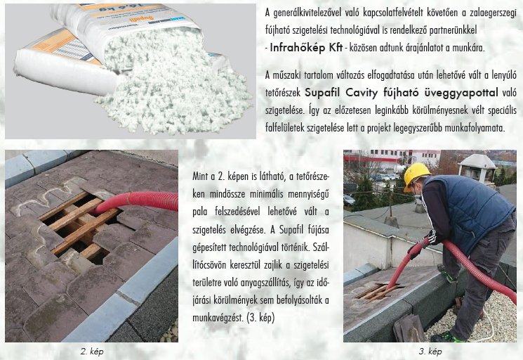 Az alábbiakban azt szeretnénk bemutatni, hogy a megszokott szigetelési technológiák helyett olykor célszerű más megoldást keresni. A múlt év késő őszén kezdődött a zalaegerszegi Kölcsey Ferenc Gimnázium energetikai felújítása. Problémát okozott azonban a képen is látható homlokzatra lenyúló tetőszerkezet alatti részek szigetelése. A kivitelezési tervdokumentáció szerint ezen részeken a palafedés és lécezés lebontásával - majd visszaeépítésével - a többi homlokzati felülettel azonos hagyományos THR szigetelés lett tervezve. Mindez nagyon körülményesnek és időigényesnek tűnt, ráadásul a lebontott anyagok visszaépíthetősége is kétségessé vált. A befejezési határidő rövidsége, valamint az időjárás bizonytalansága miatt a felújítást végző kivitelező alternatív megoldást keresett ezen felületek szigetelésére.