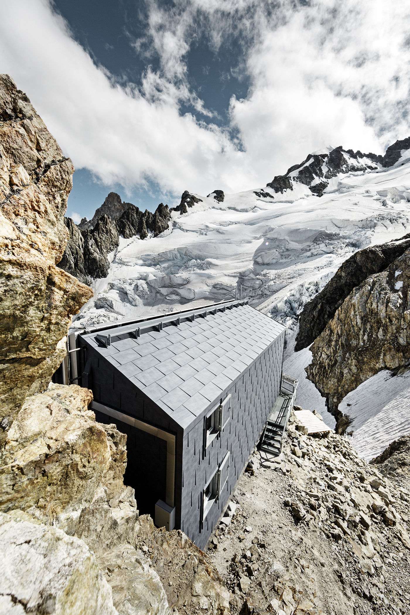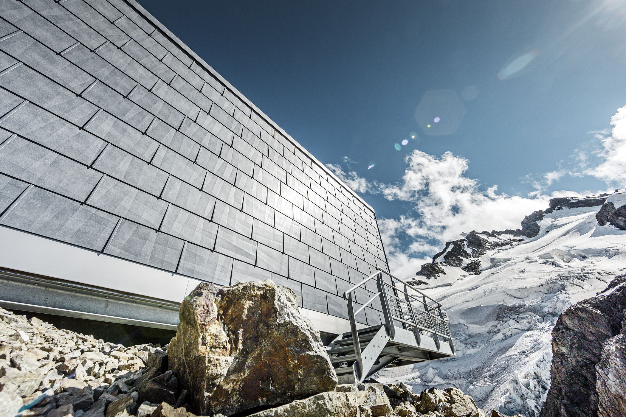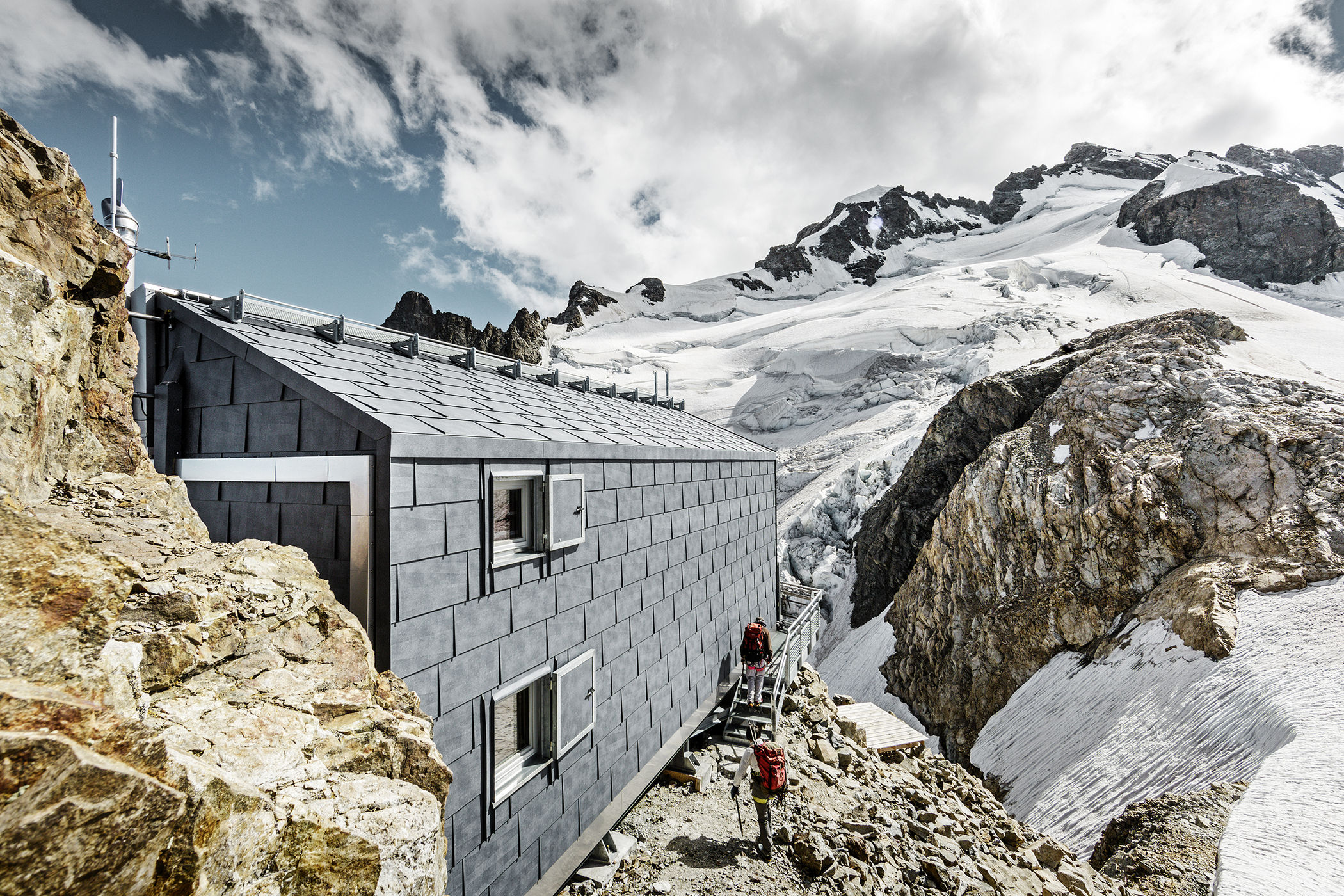 A menedékház külső homlokzati- és tetőbevonata a Prefa extrém terhelésekre is alkalmas szürke színű (P.10) FX 12 paneljével készült, amelynek ilyen körülmények közötti felhasználására nem ez a projekt volt az első példa. „Ez az egyetlen anyag, amely a nappali és éjszakai hőmérsékletkülönbség ilyen mértékű ingadozását kibírja. Emellett nem elhanyagolható szempont volt a cég e területen szerzett konkrét tapasztalata sem.” – utalt az építész a Matternhornon található Hörnlihütte projektre, amely a Prefa másik kiemelkedő alpokbeli referenciája.