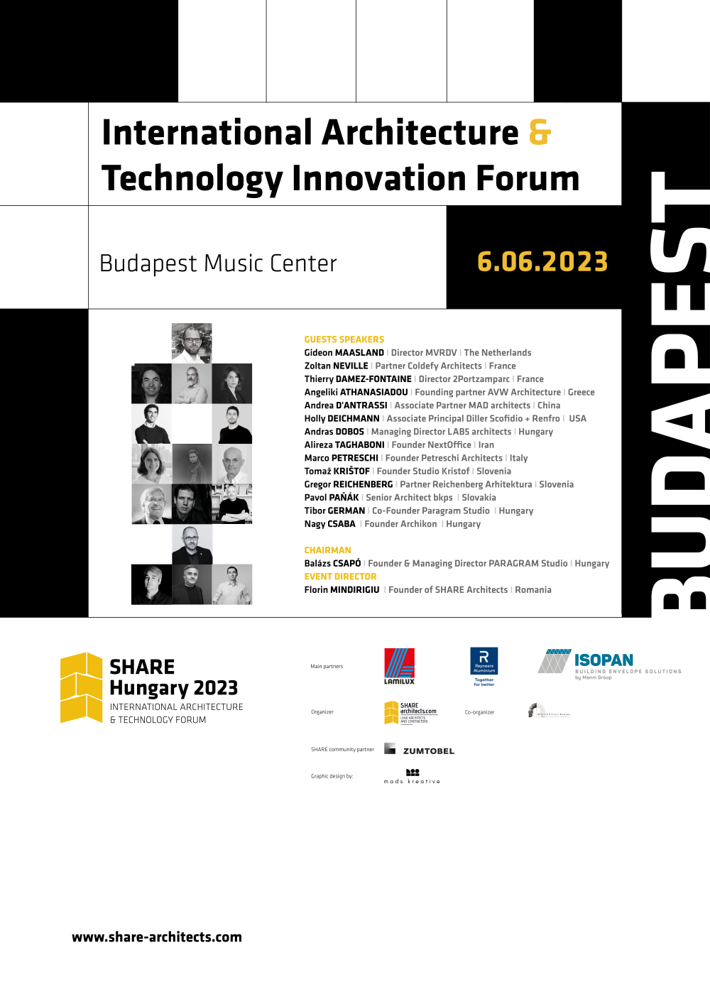 A SHARE Magyarország 2023 a SHARE Architects, Közép- és Délkelet-Európa vezető építészhálózati platformja szervezésében, a Magyar Építész Kamara partnerségével, a Lamilux, Reynaers és Isopan támogatásával, a Zumtobel és az Építészfórum médiapartnerségével valósul meg.