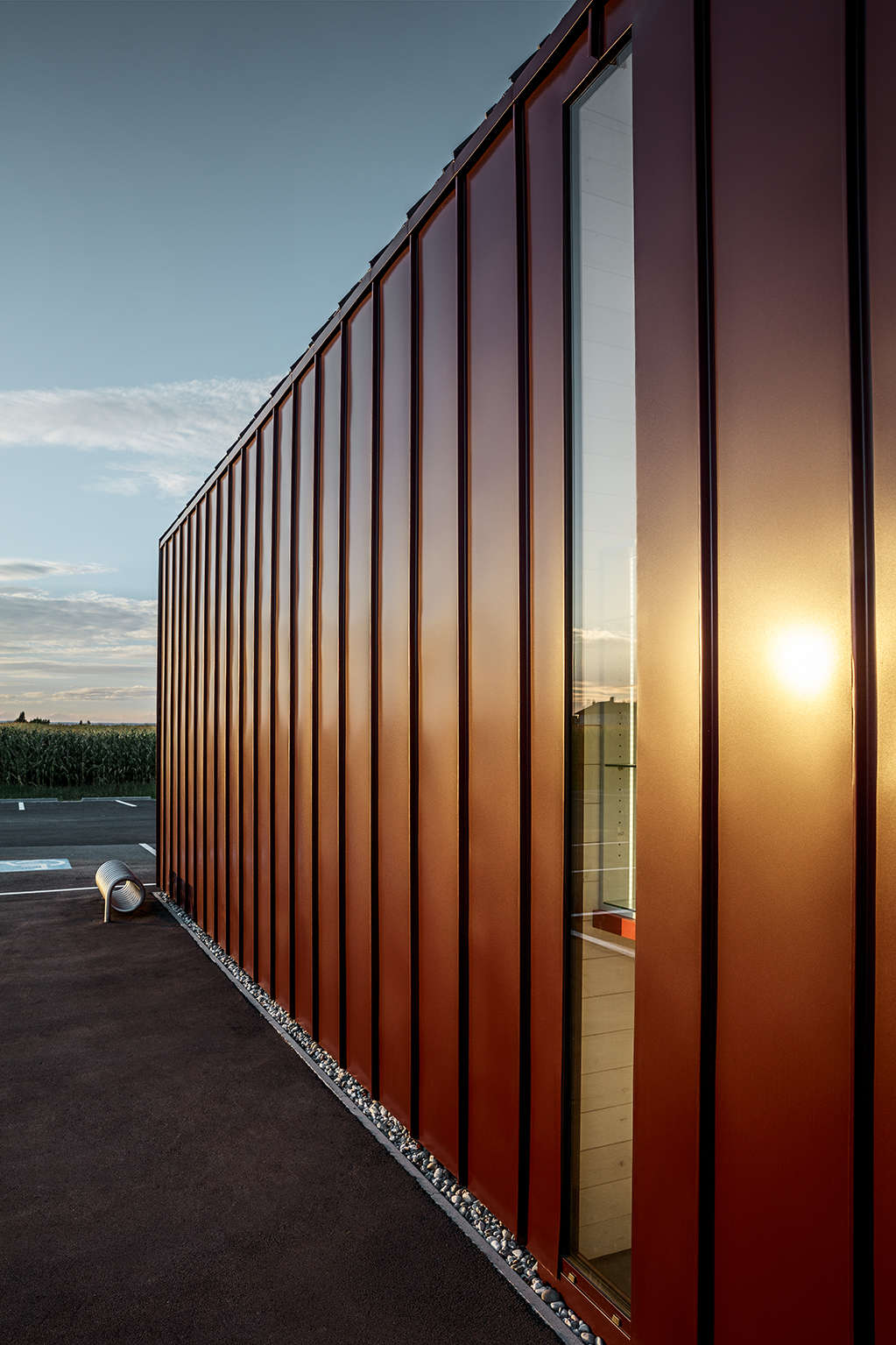 Nem tudni, hogy az építészek egy cigarettaszünetben, a felszálló füstben látták meg a kettő, középen összekötött meredek és keskeny tetős megoldást vagy sem. Az viszont biztos, hogy akár milyen kicsi a feketés vörös PREFA alumínium burkolattal borított, szokatlan formájú épület, de izgalmas kihívást kínált.