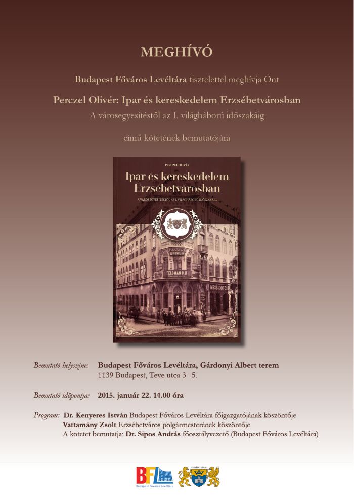 Budapest Főváros Levéltára bemutatja Erzsébetváros Önkormányzatának gondozásában megjelent Ipar és kereskedelem Erzsébetvárosban című kötetét, melyre tisztelettel meghívjuk Önt és Kollégáit!