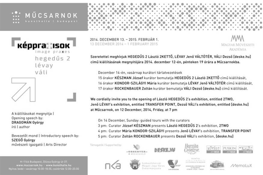 Lévay Jenő Váltótér – A rétegződés fogalma időbeli és térbeli értelemben egyaránt fontos szerepet játszik Lévay Jenő művészetében. Ő ezt a folyamatot „párbeszédes formaként” határozza meg. A valóság egy objektuma fotóval leképezve számítógépre kerül, majd a számítógépen végzett alkotói beavatkozások után létrejött következő rétegben visszatér a valóságba. A kiállításon szereplő munkái sorozatokba rendeződve mindig valamilyen művészeti akció lenyomatai és dokumentumai. A címek beszédesek: Sóhajlétrák, Videotilusok, Időmérő, Gondolatrészvények, Páternoszter, Váltótér, Tömegszerencse. A kiállításon szerepelni fognak használati tárgyakból továbbgondolt installációk (Lélekvessző) és a Liszt-transcliptions című videómunka is, a látogatónak pedig lehetősége nyílik majd akár saját harmonogramot is készíteni, és a létrehozott felvételek egymáshoz való viszonyát is megfigyelni.