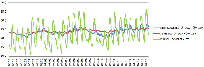 Amint az alábbi grafikonon megfigyelhető, a szigetelt épületben lényegesen kiegyenlítettebb a belső hőmérséklet, mivel kevésbé van kitéve a külső hőmérsékletváltozás hatásainak. Igaz ez a július 10-13. közötti tartós lehűlés időszakára is, ahol a belső hőmérséklet 2-3 °C-kal magasabb volt. A szigetelt épület felmelegedése (csúcsértékek) lényegesen kisebb mértékű a szigeteletlenhez képest.