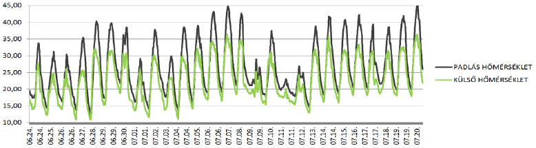 Érdekes megvizsgálni a könnyűszerkezetű, teljesen szigeteletlen és szellőzés nélküli padlástérben uralkodó hőmérsékleti értékeket. Látható, hogy a hőmérséklet ingadozása óriási, napsütéses, 37 °C körüli hőmérséklet esetén a padlástér hőmérséklete a 45 °C-ot is eléri. Ezen mérés is azt támasztja alá, hogy a padlásterek nyári átszellőztetése elengedhetetlen a kedvező belső klíma biztosítása érdekében.