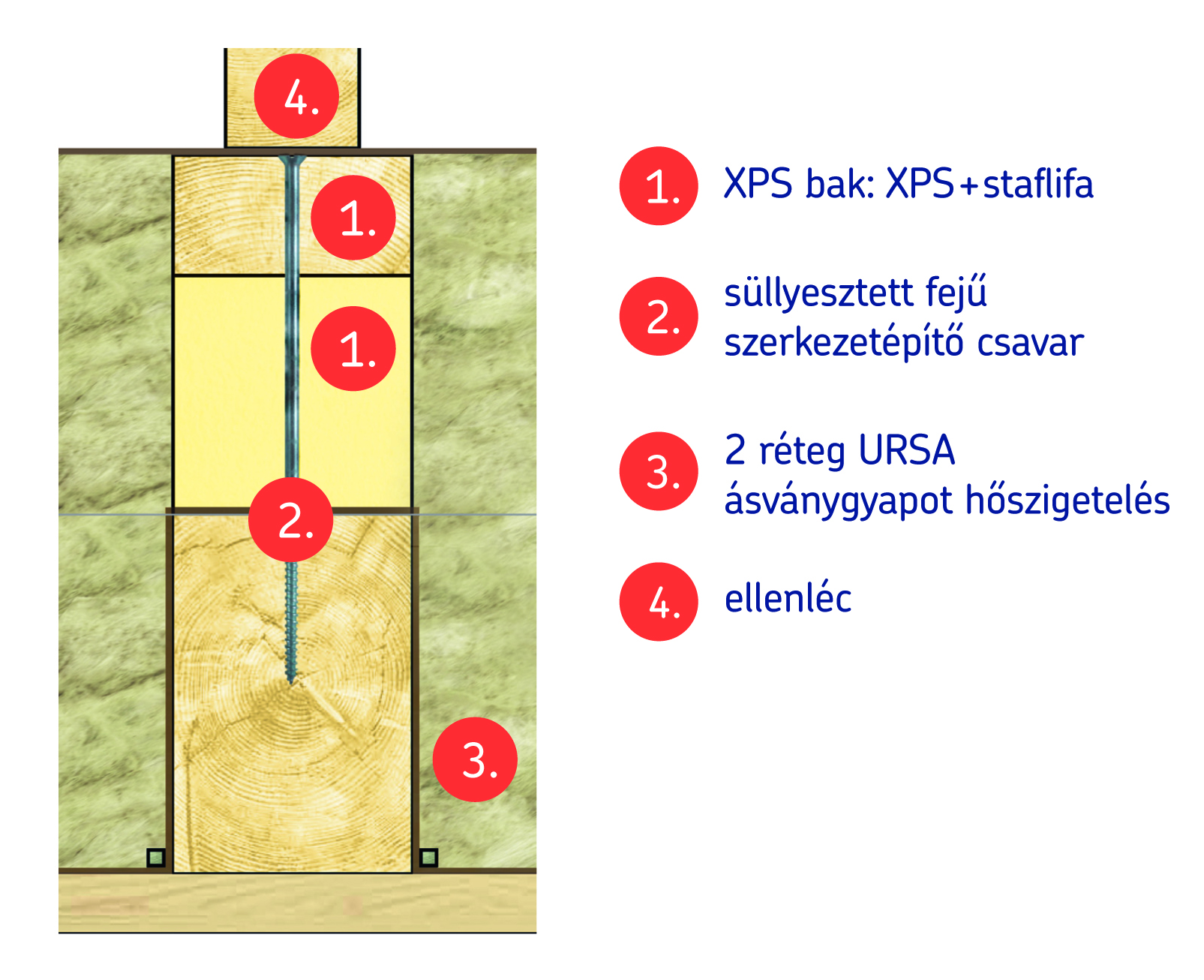 A szarufák magasítása és hőhídmentesítése min. 7,5 cm széles URSA XPS-bakokkal történik, amelyek a teherhordó, teherátadó és hőhídmegszakító URSA XPS zárt cellás keményhab polisztiroltermékből, valamint egy min. 5 cm vastag leszorítóstafniból állnak. A szarufákra csavarozott bakok magassága 20–30 cm – a kívánt szigetelési vastagság függvényében –, közeit teljes magasságukban ki kell tölteni szoros toldással beépített URSA ásványgyapottal.