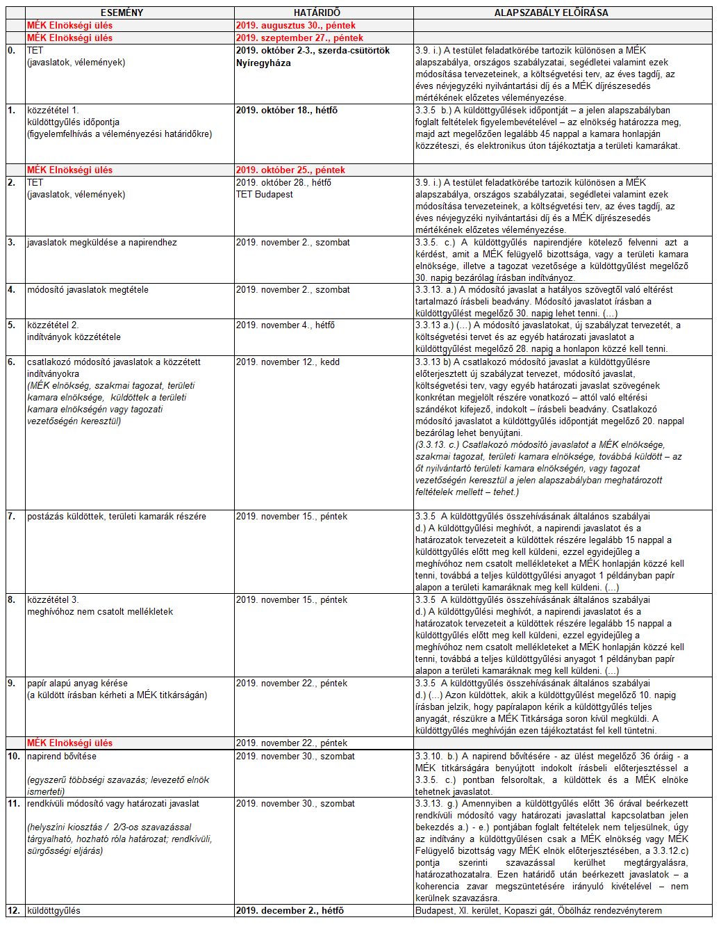 A küldöttgyűlésre vonatkozó határidők: