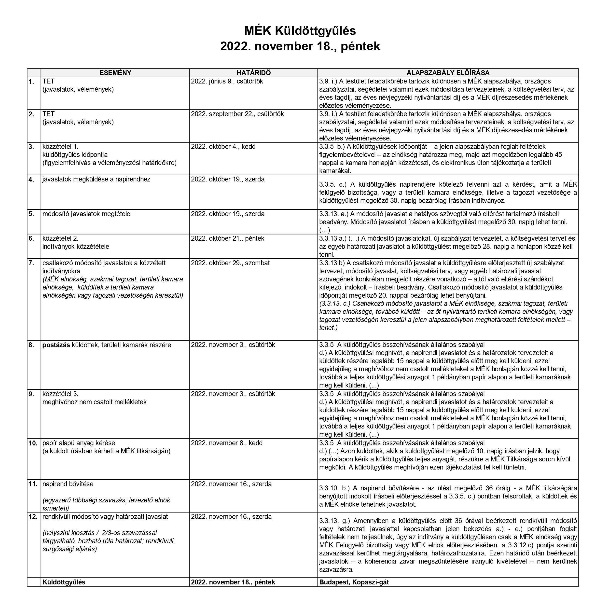 A Magyar Építész Kamara soron következő küldöttgyűlésének időpontja a MÉK Elnökségének 20/2022. (09.02.) sz. határozata alapján 2022. november 18, péntek.