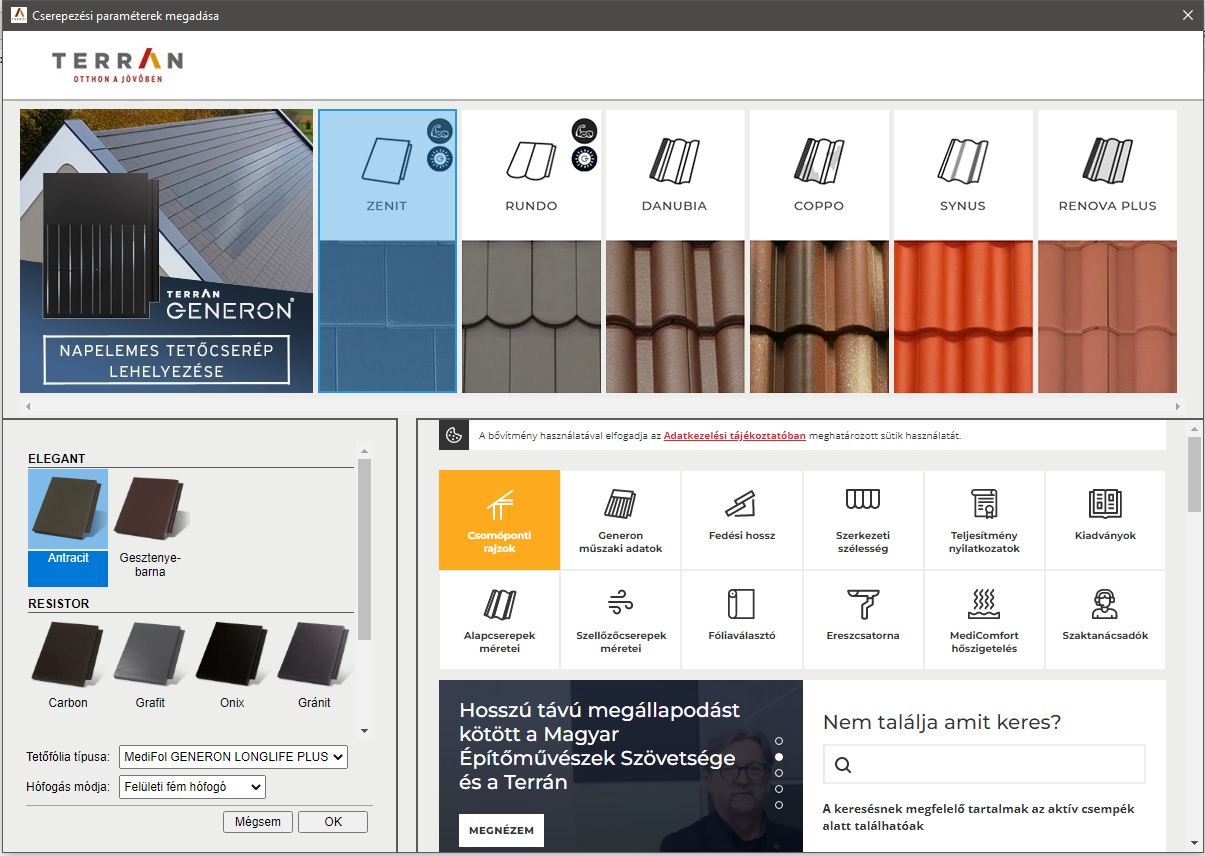 Az AddOn nemcsak megújult, hanem ki is egészült: mostantól a Terrán Generon napelemes tetőcserépről naprakész részletes tervezői információk érhetők el – csomópontok, alátéthéjazati információk, termékleírások, adatok, teljesítmény-nyilatkozatok –, valamint a napelemes tetőcserép a tervekbe beilleszthető (az előírásoknak megfelelő szabályokkal) és ráhelyezhető a megrajzolt tetőre, így a látványterven a Terrán Generon esztétikai előnyét is láthatja az építtető már a tervezési fázisban.