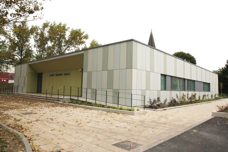 A tervezőknek teljesen újra kellett gondolniuk az épületet, hiszen a meglévő háziorvosi rendelő semmilyen mai műszaki követelménynek nem felelt meg. A földszint teljeselbontása után a pince lett az épület körvonala. A homlokzatra mindenképpen táblás burkolati elemet képzeltek, mertszerették volna megtartani a két bejárat szoborszerű tömegét. Ezért esett a választásuk az EQUITONE szálcement homlokzati lapokra. „A modern design és természethű választék mellett fontos érv volt, hogy lehetőség van az anyag ragasztásos rögzítésére, illetve hogy a lapok tartósan ellenállnak az elemi erőkkel szemben.” – indokolta anyagválasztását Mészáros Erzsébet, a nyertes építésztrió tagja.