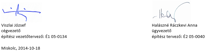 Halászné Ráczkevi Anna, mint a V+A Viszlai Építész Iroda Kft ügyvezetője, valamint Viszlai József Építész vezetőtervező, nyilatkozunk, hogy a Miskolc, Május 1 telep 40864 Hrsz.-ú területen létesítendő Lakópark építési engedélyezési terveit elkészítettük a MIS-ING Ingatlanforgalmazó és Fejlesztő, Tanácsadó Kft. (3527 Miskolc, Bajcsy Zsilinszky u. 17.) megrendelésére, írásban megkötött szerződésünk, és annak kiegészítései alapján. A jogerős építési engedély megszerzésével teljesített tervezői munkarészek, (építészeti, statikai, épületgépészeti, villamos tervezői munkái) kifizetetlenek, ezért az Egyetemi Lakópark (Miskolc, Május 1 telep 40864 Hrsz.) terveinek felhasználásához, továbbtervezéséhez vagy értékesítéséhez, mint a szerzői és vagyoni jogok tulajdonosai nem járulunk hozzá. Kérjük a kollégákat, a tárgyi ingatlanra tervezési munkát ne vállaljanak.