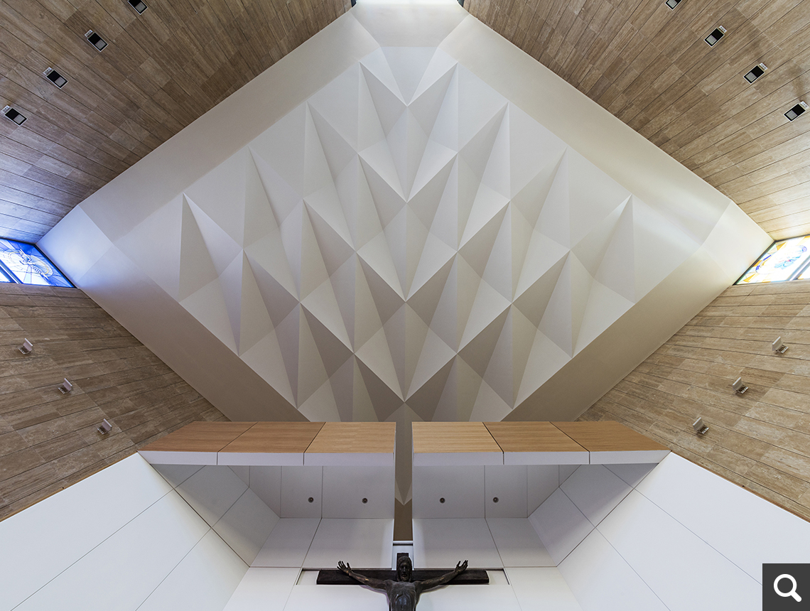 A Váci úti irodafolyosón 1985 óta álló templom Szabó István Ybl díjas építész egyik utolsó alkotása. A szűk építési teleket teljes mértékben betöltő templom és plébánia épület újszerű emeletes elrendezésével és tömbszerű formálásával a mester kiváló alkotása volt. Különösen értékes az emeleti templom téri megformálása. Az idők folyamán az eredeti tömeg az új irodaházak között jelentéktelenné vált és a templomhoz vezető külső lépcsősor sem felelt meg a hívek elvárásainak. A közösségi terek is átalakításra vártak. A tervezők példaszerűen oldották meg az átalakítás nehéz kérdését. Az épület megmaradt tömbszerűnek, sőt ha lehet, az eredeti szándék még erősebben nyilvánul meg a sorolt tömegek lépcsősor, utcai kiugrás egy tömegbe vonásával.